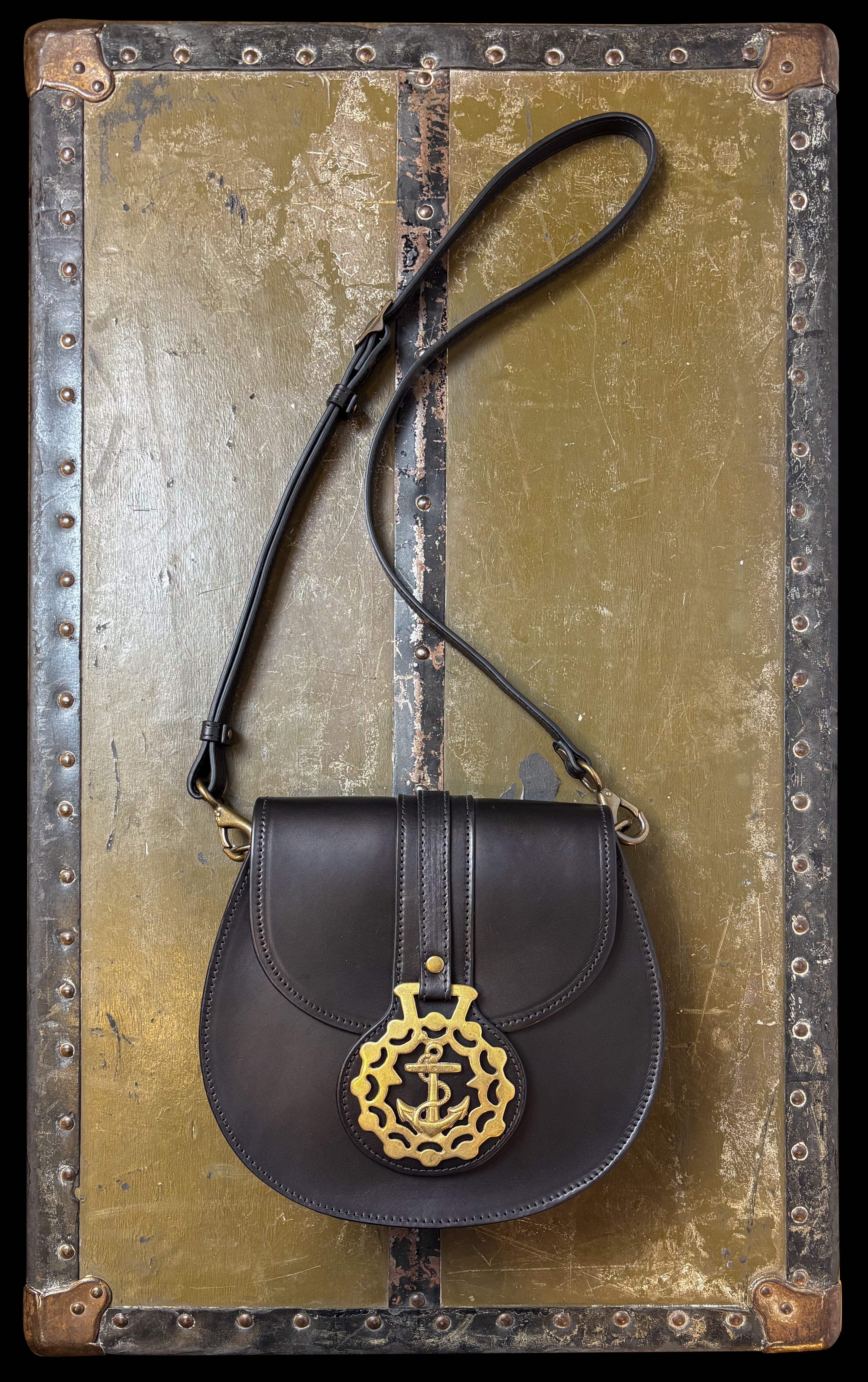 A small-batch leather bag inspired by equestrian history, handcrafted in the USA from sustainable bridle leather and adorned with its own authentic vintage horse brass.