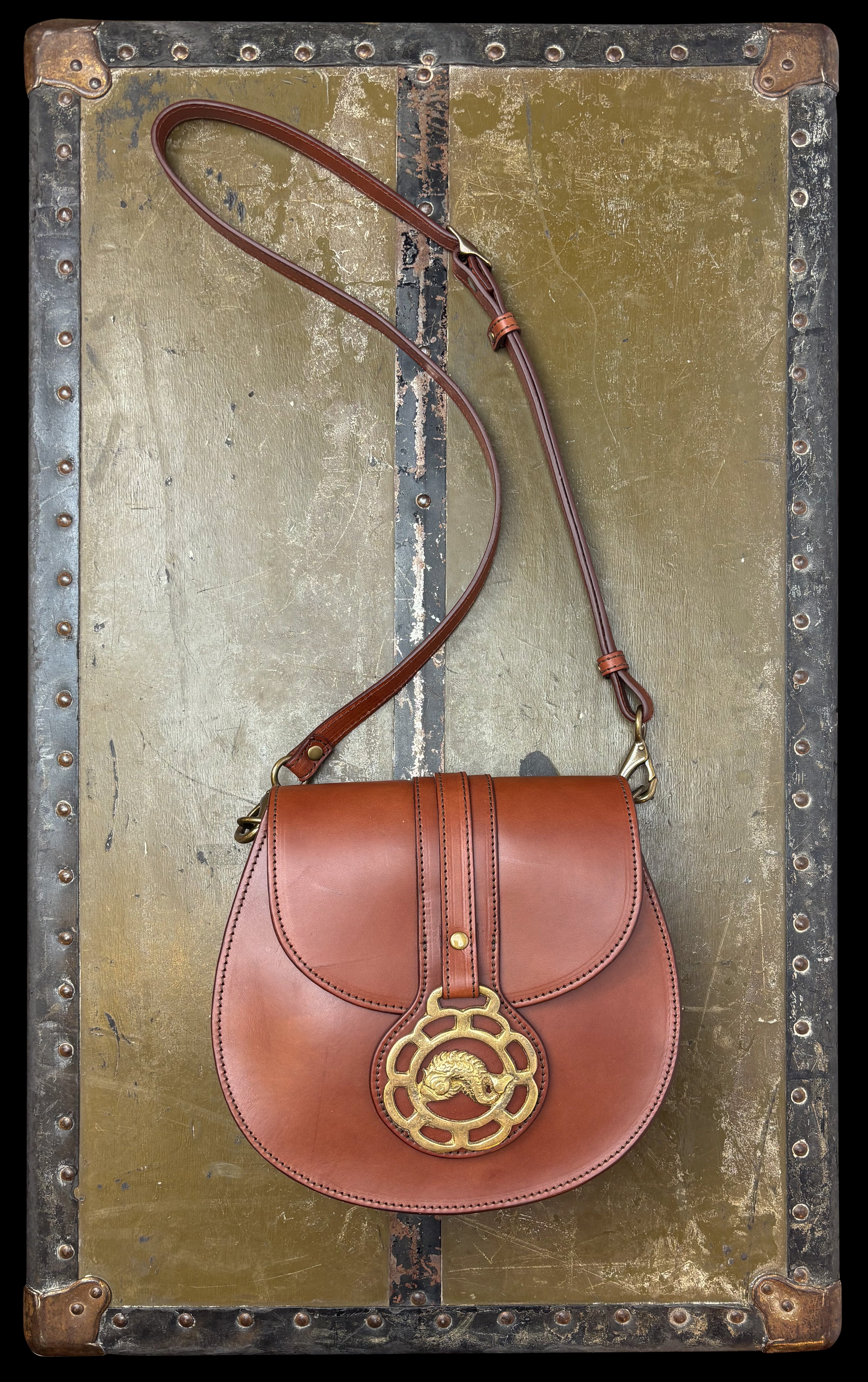 A small-batch leather bag inspired by equestrian history, handcrafted in the USA from sustainable bridle leather and adorned with its own authentic vintage horse brass.