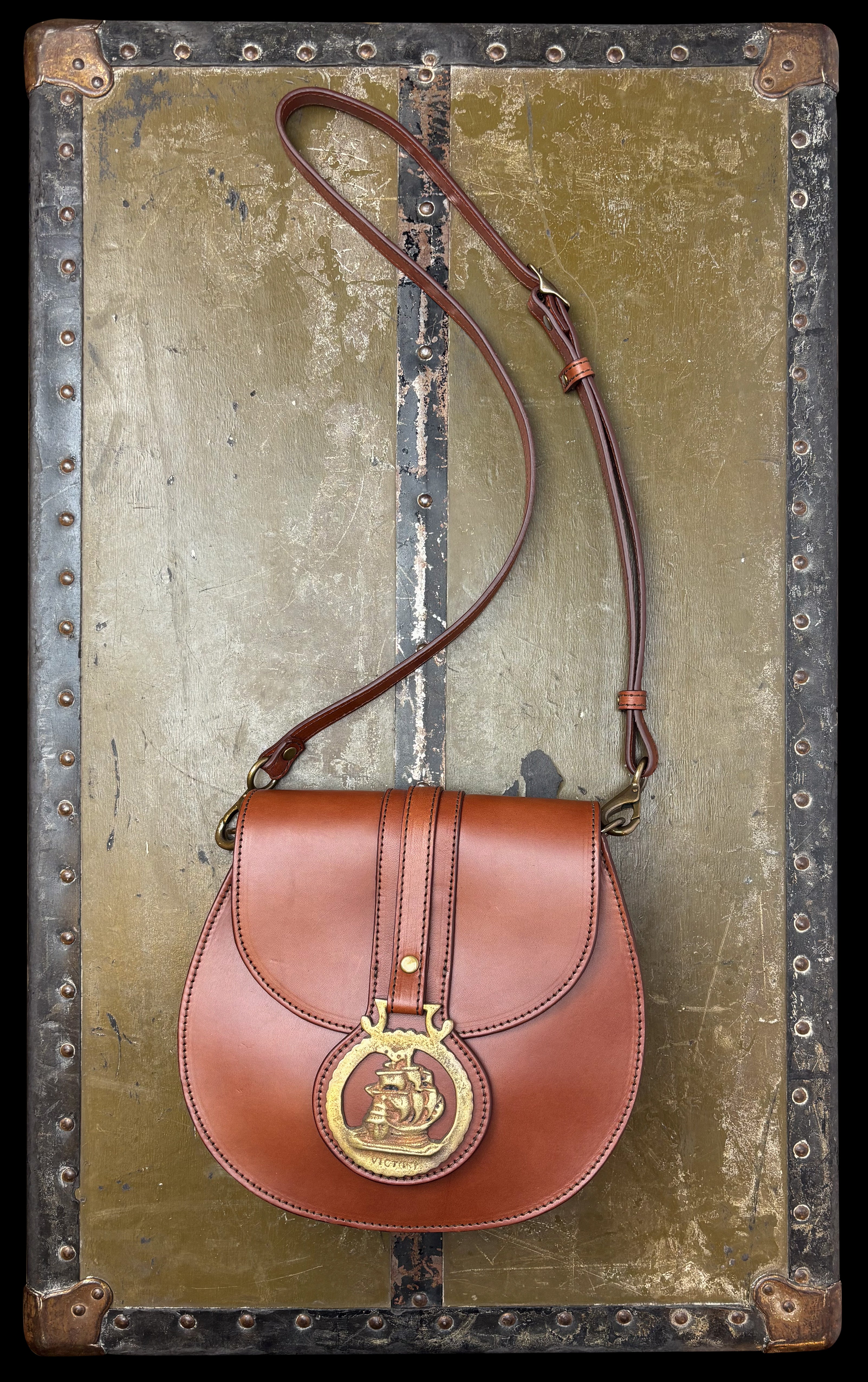 A small-batch leather bag inspired by equestrian history, handcrafted in the USA from sustainable bridle leather and adorned with its own authentic vintage horse brass.