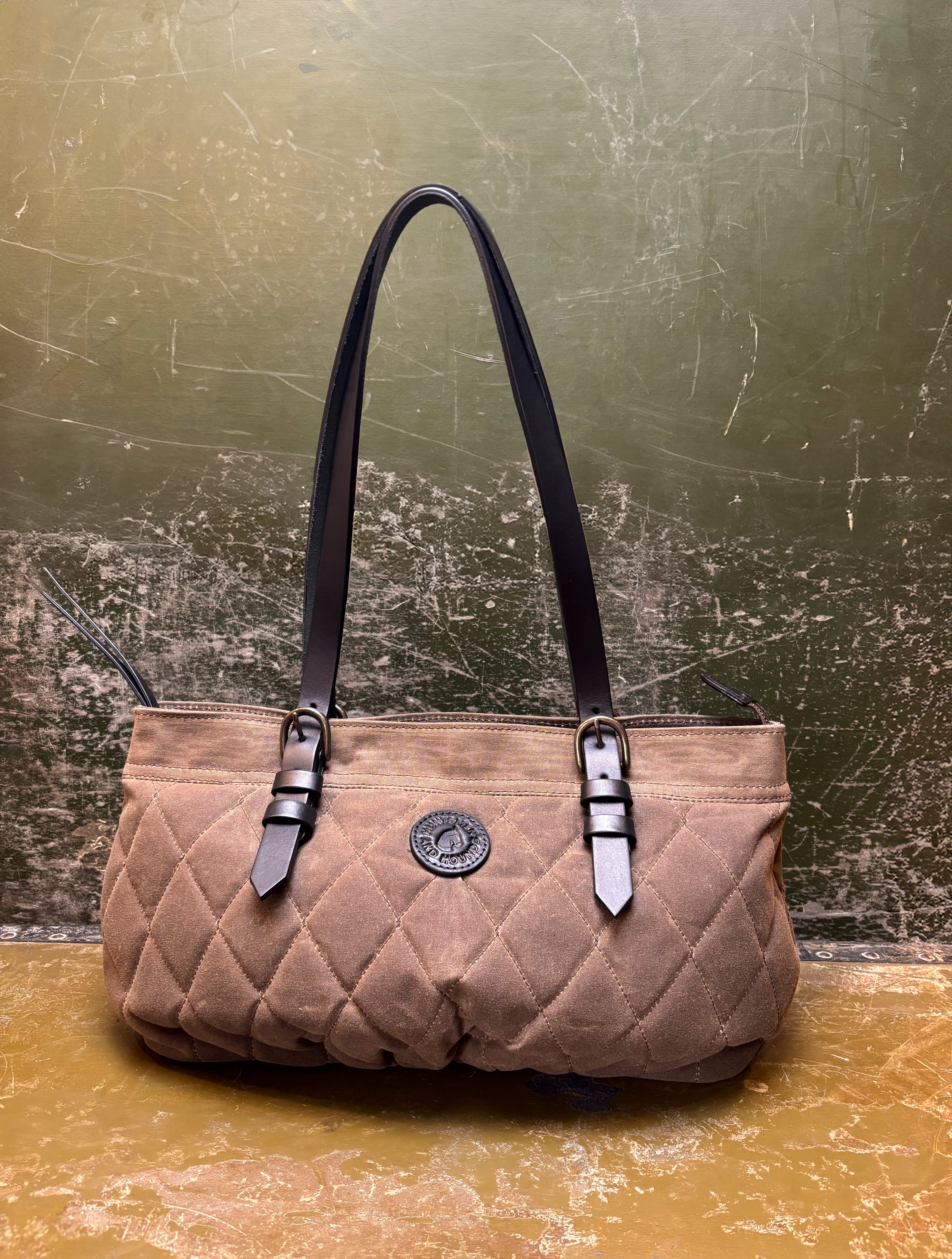 The Baguette Bag — meticulously crafted in small batches from custom quilted cotton waxed canvas, lined with remnant fabrics, and accented with the same high-quality USA bridle leather and solid brass hardware used in our signature pieces.
